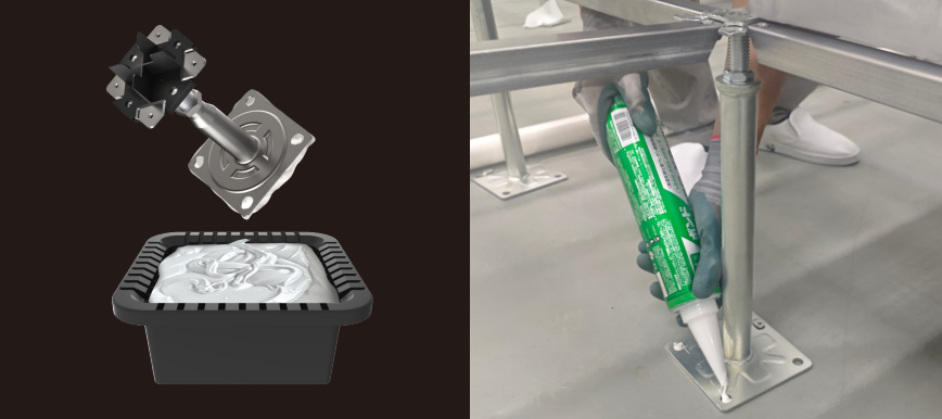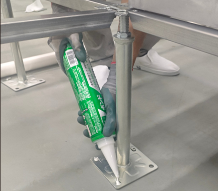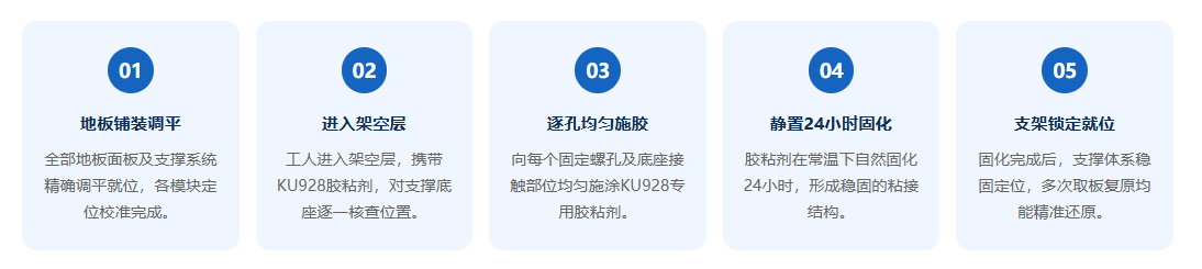 配合日本小西KU928支架專業(yè)膠粘劑將支架牢牢固定,即使頻繁拆裝檢修,支架體系始終紋絲不動(dòng),地板面板可精準(zhǔn)二次復(fù)原(詳見(jiàn)下文輔材章節(jié))。